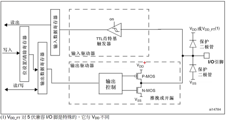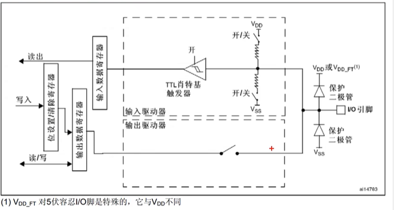 3.MOS管:上面是P-MOS,下面是N-MOS,MOS管相当于一种电子开关,信号来控制开关的导通和关闭,开关负责将IO口接到VDD或VSS,在这里可以选择推挽、开漏或关闭三种输出模式