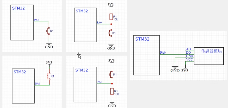 1.左上角图:随便选取一个GPIO口,然后通过K1接到地,当按键按下时,GPIO口直接下拉到GND,此时读取GPIO口的电压就是低电平,当按键松手时,GPIO口被悬空,引脚电压不确定,所以必须要求引脚是上拉输入模式,否则会出现电压不稳定的错误现象,在这种方式下,按下按键,引脚为低电平,松手,引脚为高电平