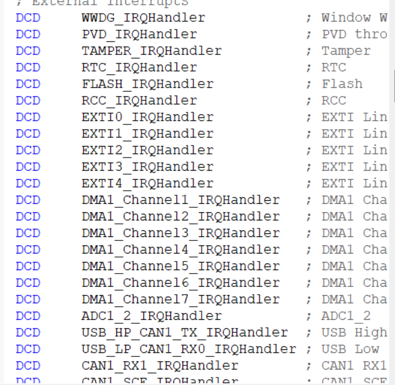 2.找到中断向量表(如上图所示,以IRQHandle结尾的字符串就是中断函数的名字)