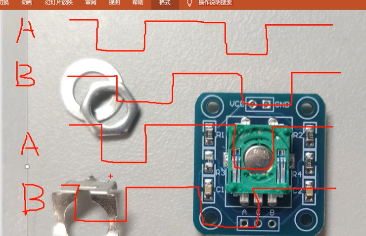 3.编码盘:再旋转式,依次连接和断开两边的触点,能让两侧触点的通断产生一个90度相位差,最终配合以下外部电路,生成以下波形