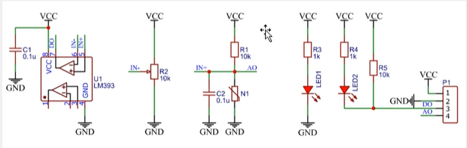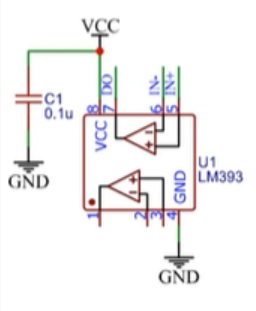2.数字输出:对AO进行二值化输出,二值化通过LM393完成输出,LM393是一个电压比较器芯片,里面有两个独立的电压比较器电路,C1为滤波电容,电压比较器相当于运算放大器,当同相输入端电压大于反相输入端的电压时,输出就会瞬间升高为最大值也就是输出接VCC,反之当同相输入端的电压小于反相输入端的电压时,输出就会瞬间降低为最小值也就是输出接GND这样就可以对一个模拟电压进行二值化了