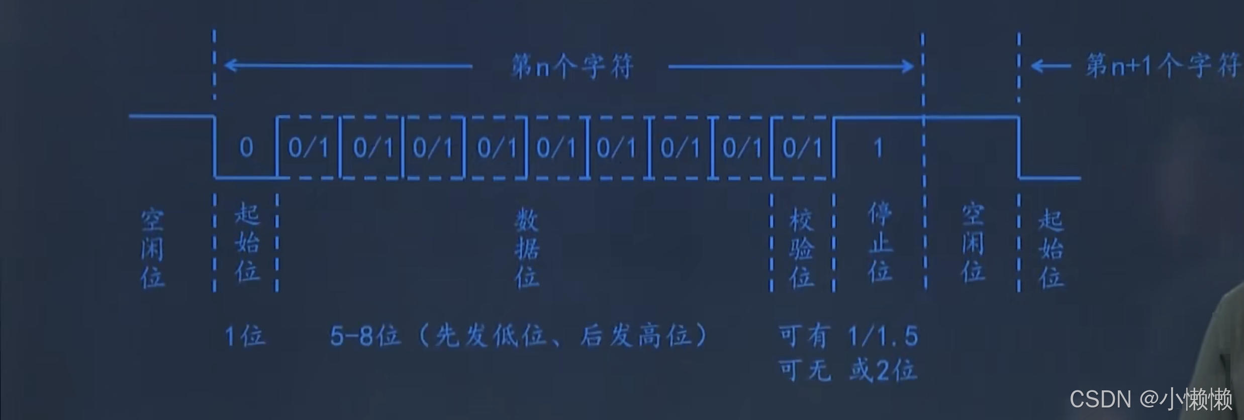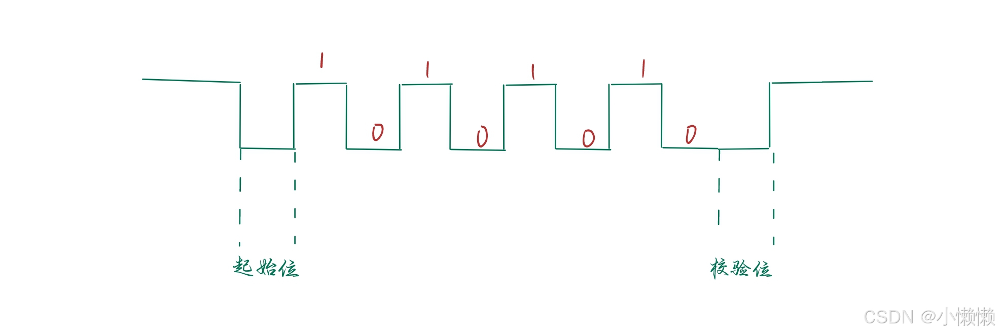 - 校验位:分为奇校验、偶校验和无校验三种模式。数数据位中有多少个1,如果是偶校验,数据位中有偶数个1,则校验位为0,反之为1;如果是奇校验,数据位中有奇数个1,则校验位为0,反之为1。简单来讲,偶校验凑偶数个 1,奇校验凑奇数个 1。
