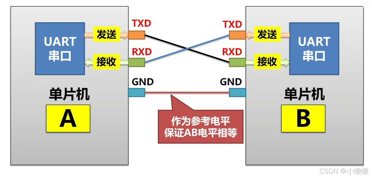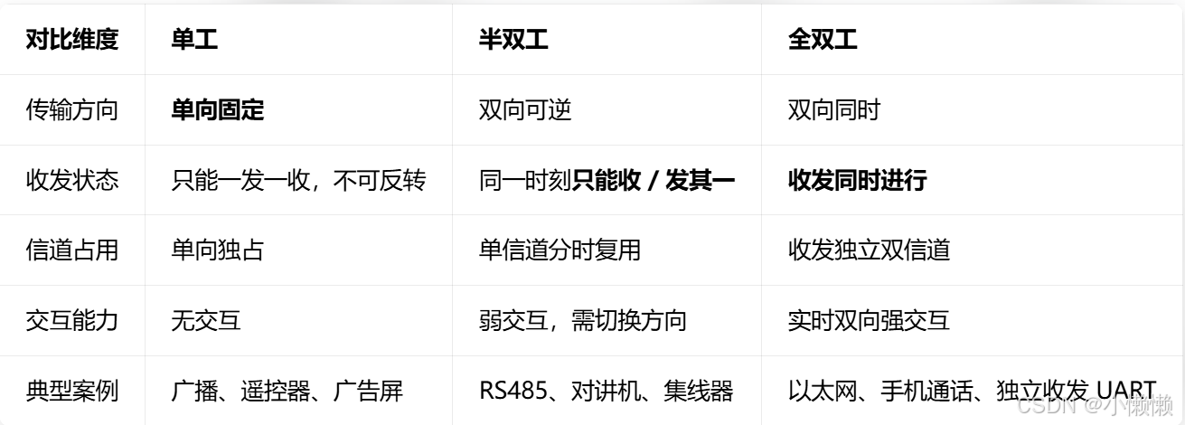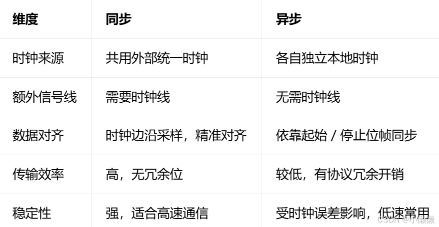 异步通信 :无公共时钟线,收发双方使用各自独立时钟,依靠协议约定(起始位、停止位、校验位)实现数据对齐。