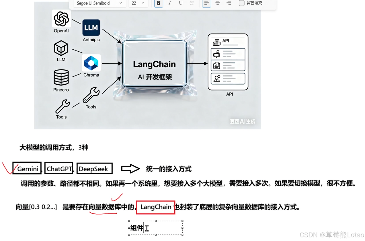 LangChain 则封装了不同 LLM、向量数据库、外部工具的交互复杂性,开发者无需为每个厂商编写不同的 API 调用代码,通过统一接口就能实现模型切换、能力集成。