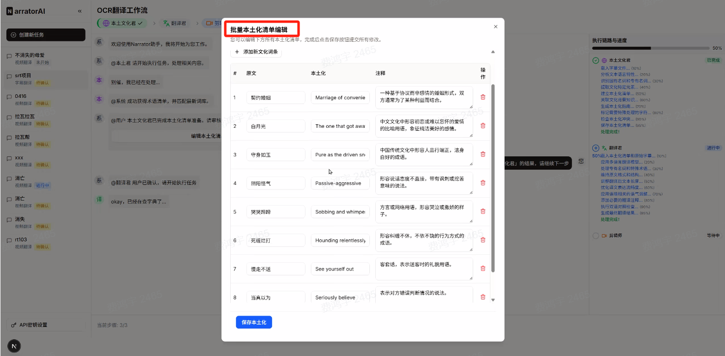 这份清单在 NarratorAI 的产品界面里是可编辑的 。用户可以在系统自动生成清单之后,手动修改、增删条目,然后再提交给翻译君执行。这是"人机协作"设计的核心体现------AI 负责批量提取,人负责最终把关。