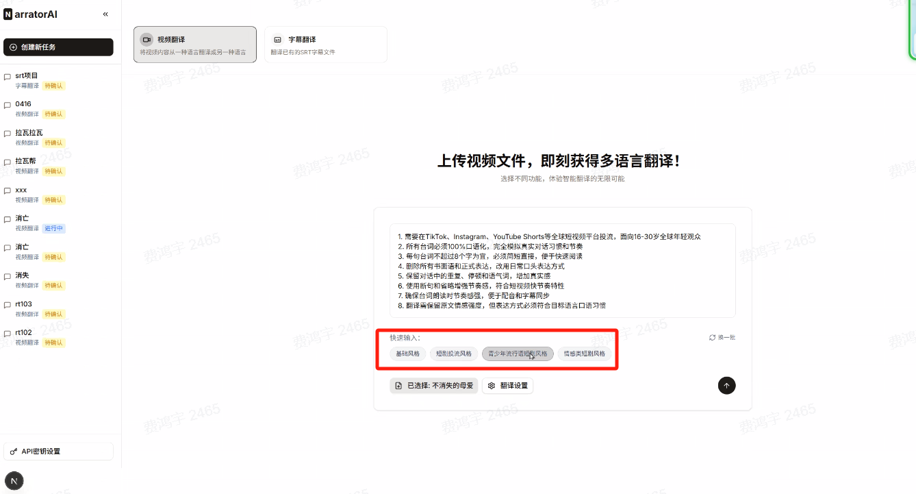 翻译风格模板是翻译君的另一个差异化设计。不同的投放平台,观众群体和内容调性不同,翻译风格也应该不同: