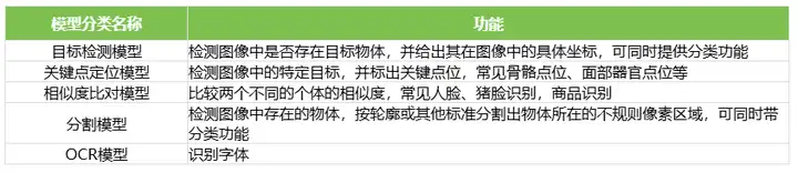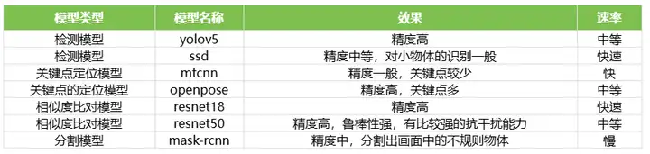 通常来讲,对于同一个功能,存在着不同的模型,它们在精度、计算速率上各有长处。模型来发现主要来源于学术研究、公司之间的公开比赛等,所以在研发过程中,就需从业人员持续地关注有关ai新模型的文章;同时对旧模型的积累分析也是十分重要的,这里我们在 下表 中列出目前在各个功能上较优的模型结构以供参考。