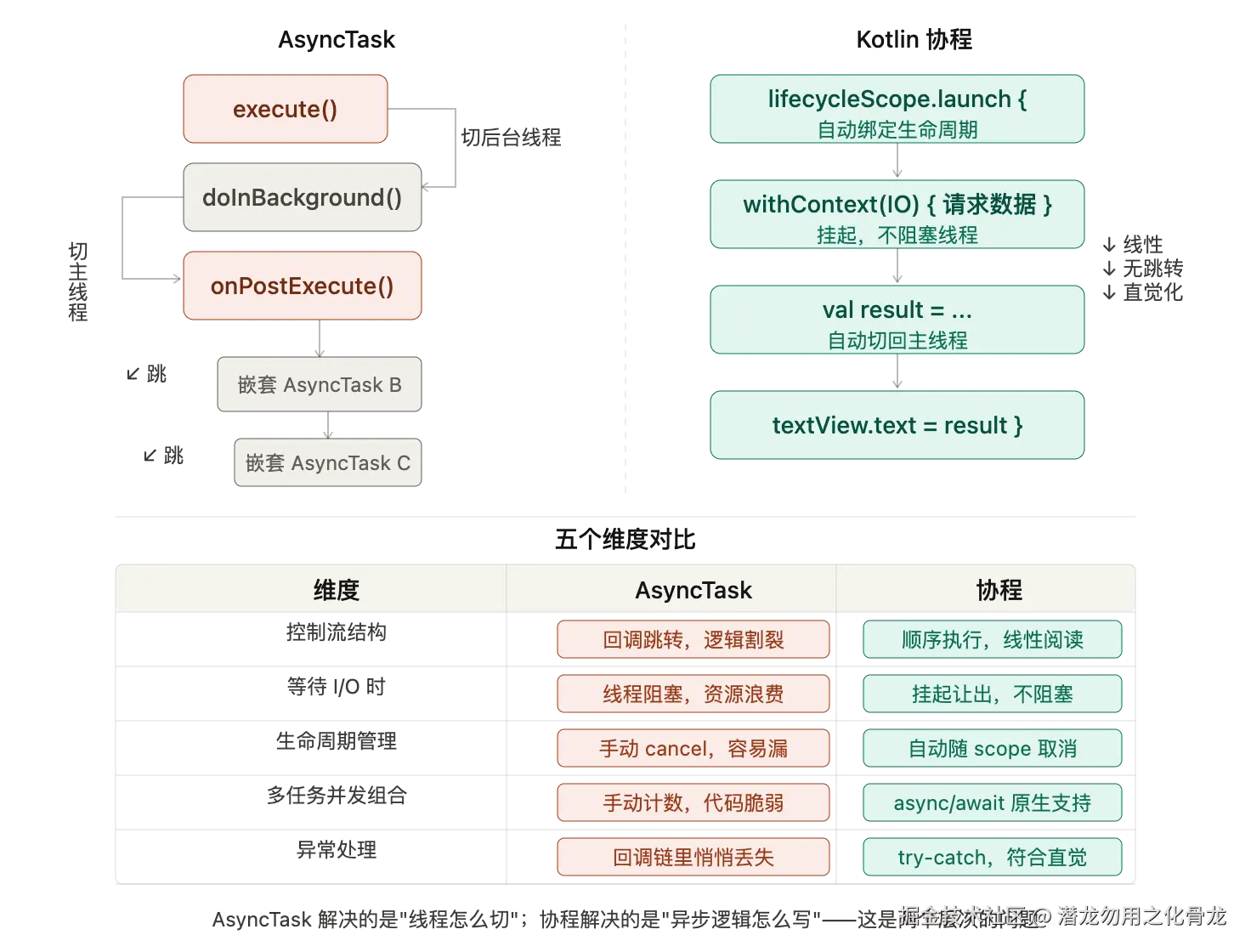 协程的出现,是语言层面的升级。 它不是"更好的 AsyncTask",而是直接改变了游戏规则: