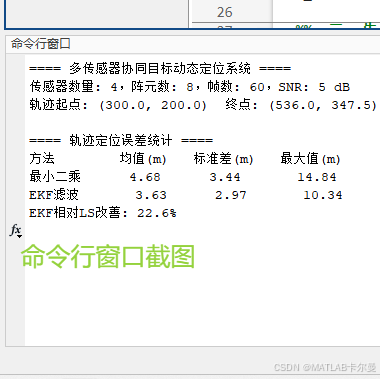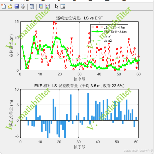 - 命令行窗口同步输出LS与EKF的均值/标准差/最大误差及EKF的相对改善百分比。
