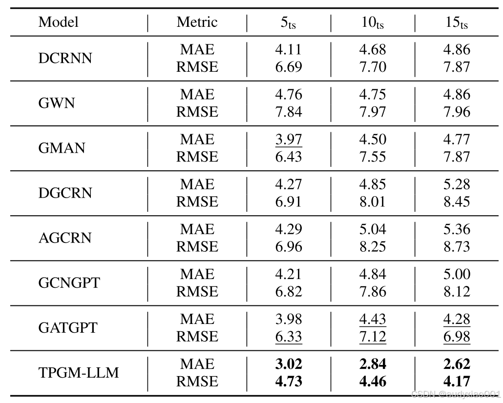 在高峰时段预测能力方面,作者专门选取工作日7:00--9:00和17:00--20:00的高波动交通时段,分别预测未来5、10、15个时间步。如表2所示,TPGM-LLM在三个预测跨度下依然显著优于所有对比方法,其MAE分别为3.02、2.84、2.62,RMSE分别为4.73、4.46、4.17。论文特别指出,一个很有意思的现象是:随着预测步长增加,其他模型误差普遍升高,而TPGM-LLM的误差反而呈下降趋势。作者认为,这与突发事件对交通流存在延迟扩散效应有关------例如事故发生后,拥堵往往在大约40分钟左右达到最严重状态,因此文本事件信息能够帮助模型更早捕捉这种滞后影响,从而在更长预测跨度上体现出更明显优势。