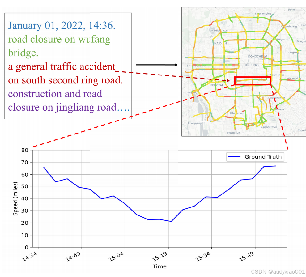 此外,传统基于图卷积的方法在处理非直接空间关联时存在局限性。而现有的大语言模型(LLM)虽然在处理文本方面表现优异,但在提取深层时间模式以及将多源异构数据进行语义对齐时仍面临困难。因此,如何构建一个能同时学习空间、时间以及语义关系,并在突发事件下进行高精度长期预测的框架,成为了突破现有交通预测瓶颈的关键所在。