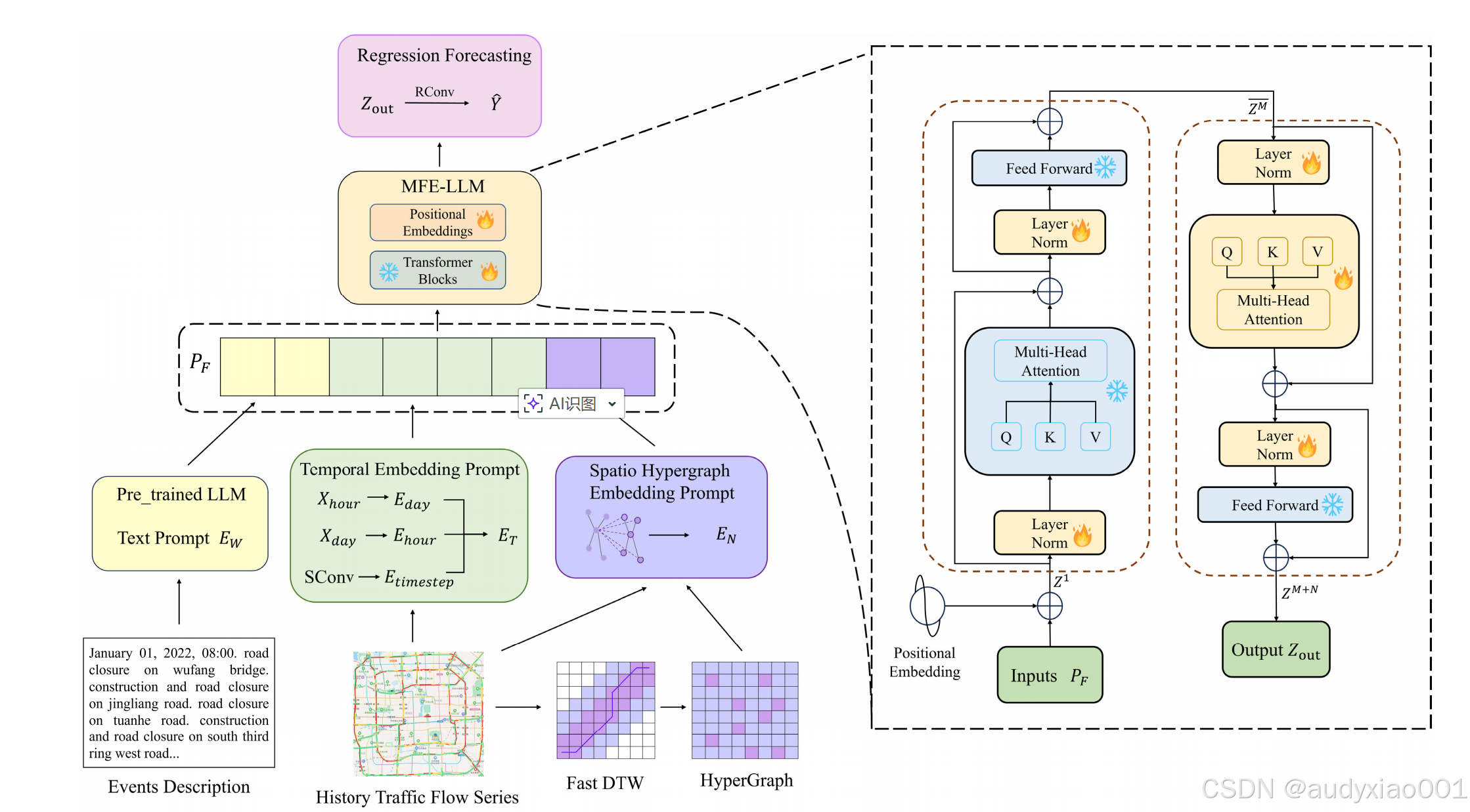 这是整个框架中负责深度融合与最终预测的核心模块。在前面三个模块分别得到文本语义特征、时间嵌入特征和时空超图特征之后,模型先通过特征融合卷积(FConv)将三类信息拼接整合,形成统一的多模态表示,再输入到基于Transformer的MFE-LLM中进行进一步建模。该模块采用了部分冻结的训练策略:浅层参数保持冻结,以保留预训练模型原有的通用序列建模能力;深层多头注意力机制则保持可训练,使模型能够针对交通预测任务学习更具针对性的时空交互模式。最终,模型将提取到的深层特征送入回归层,输出未来多个时间步的交通流预测值。总而言之,这一模块不仅完成了多模态信息的融合,还承担了把事件语义、时间规律、空间传播统一转化为预测结果的任务,是实现长期预测和复杂场景鲁棒预测的关键。