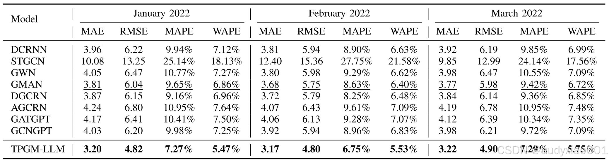 如表1所示,TPGM-LLM在2022年1月、2月、3月三个月的测试中都取得了最优结果。以1月为例,模型在MAE、RMSE、MAPE、WAPE四项指标上分别达到3.20、4.82、7.27%、5.47%。论文指出,相比当月表现最好的基线模型GMAN,TPGM-LLM的MAE提升16.0%,RMSE提升20.2%,MAPE提升24.7%,WAPE提升20.3%。2月和3月中,TPGM-LLM也分别取得MAE 3.17/3.22、RMSE 4.80/4.90、MAPE 6.75%/7.29%、WAPE 5.53%/5.75%的最好成绩,说明该模型在跨月份与多场景条件下都具有稳定优势。