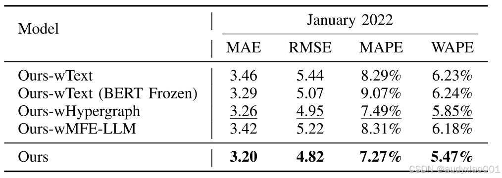 在本实验节中,论文进一步证明了各模块设计的必要性。表3提供了具体的消融数据。去掉突发事件文本提示模块后,模型性能下降最明显,说明文本语义对于识别事故、封路、施工等非常规扰动至关重要;去掉时空超图模块或去掉MFE-LLM后,预测精度也都会明显下降,表明非局部结构依赖建模和多模态深层特征提取同样不可缺少。与此同时,在多模态融合策略对比中,该论文提出的FConv也优于cross-attention和gated fusion,在1月数据上取得MAE 3.20、RMSE 4.82、MAPE 7.27%、WAPE 5.47%的最佳结果。