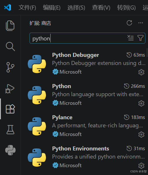 进到VSCode,下载这几个扩展,直接点击下载Python扩展,其他几个自动就下载了,不需要一个一个点。