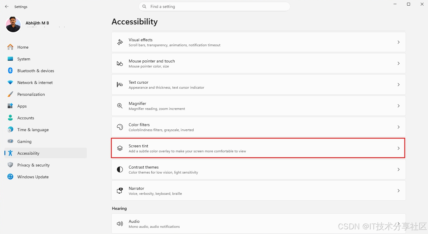 实测发现,在Win11预览版 Build 26300.8289中,「屏幕色调」功能的入口已正式上线------位于系统设置的「辅助功能」板块内,这一入口最初由网友Phantom在X平台发现,随后经WindowsLatest实测确认可用。