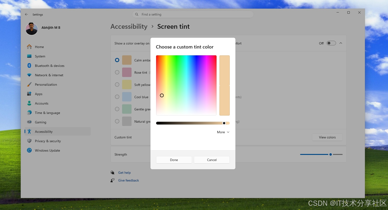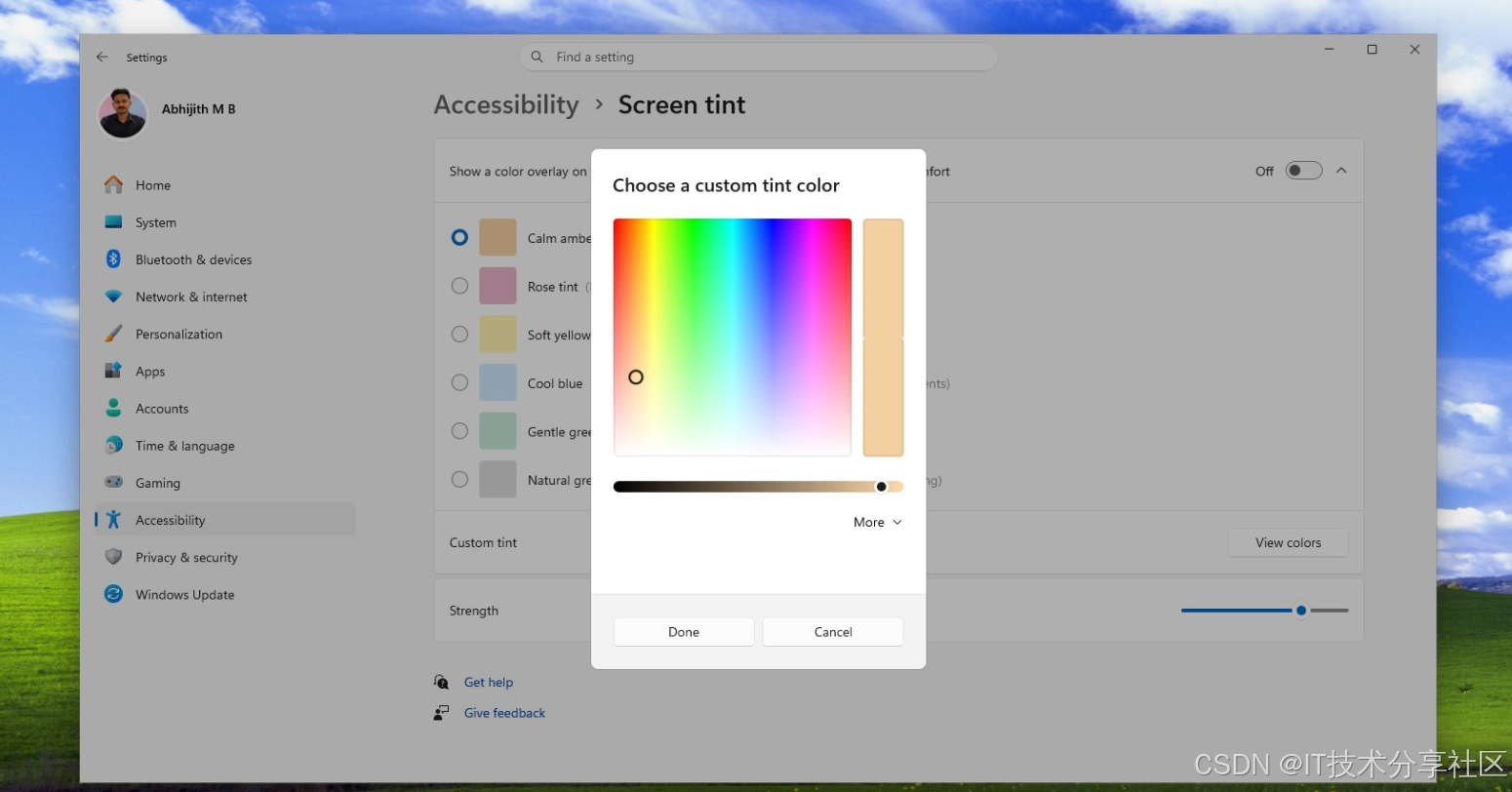 值得一提的是,「屏幕色调」功能远不止6种预设那么简单。微软还在测试「自定义色调」功能,允许用户自由选择自己喜欢的颜色,直接应用到整个屏幕,彻底打破预设颜色的限制,适配每个人的视觉习惯。