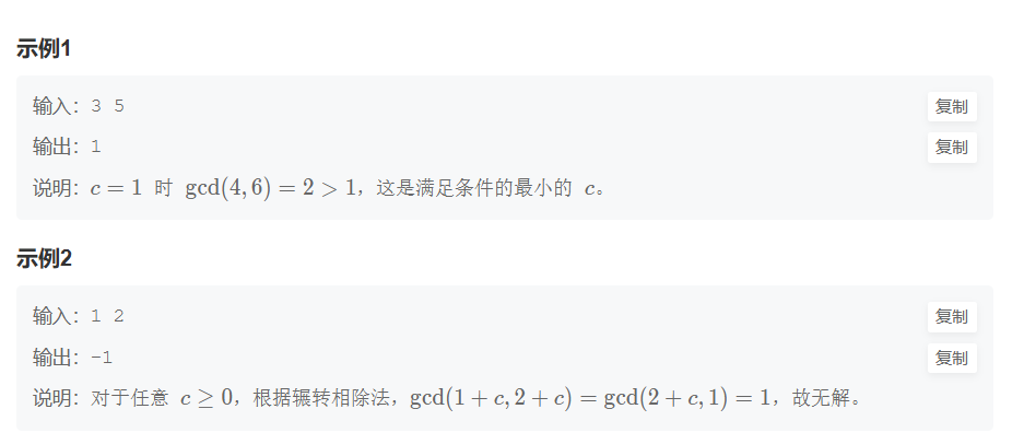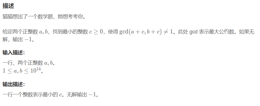 因此寻找因子的范围可以从无穷缩小为 [2,∣a−b∣][2,|a - b|][2,∣a−b∣],并且题目有说当 gcdgcdgcd 为 111 时无解,因此可以通过上述公式推导出只有 ∣a−b∣=1|a - b| = 1∣a−b∣=1 的时候才会无解。