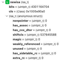 我们发现isa的类型是Class,这是因为我们定义alloc的核心方法initInstance的源码中初始化isa指针是通过isa_t类型初始化的。