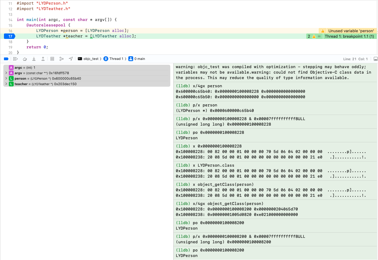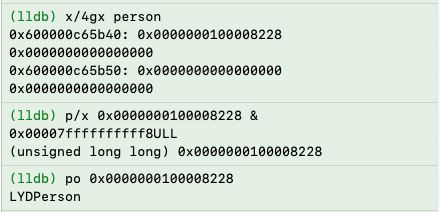 这里0x0000000100008228是person对象的isa指针地址,其&后得到的是创建person的类LYDPerson;0x0000000100008200是isa中获取的类信息所指的类的isa的指针地址,即LYDPerson类的类的isa指针地址,在苹果中我们把一个类的类叫做元类。因此打印信息相同,都为LYDPerson。
