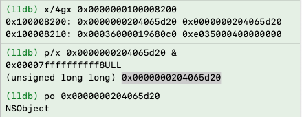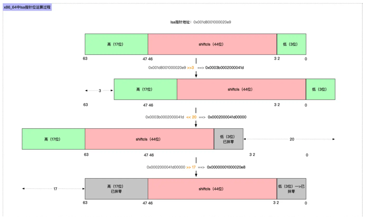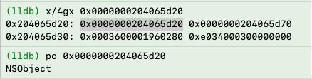 shiftcls只有44位的大小,这44位存储了一个类信息,需要经过位运算,手动通过位运算找到shiftcls对应地址输出cls地址对比。
