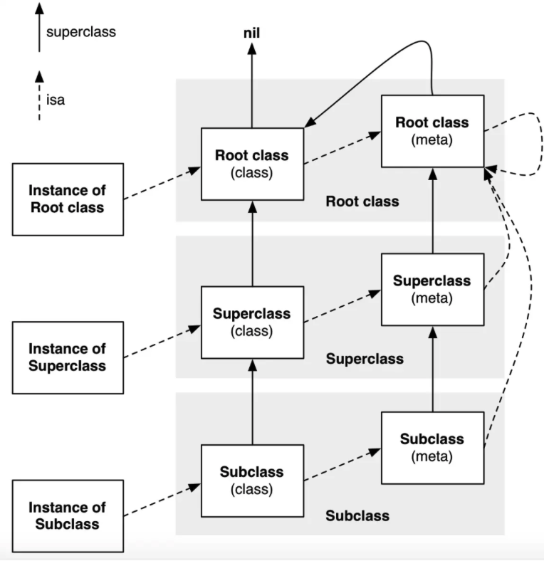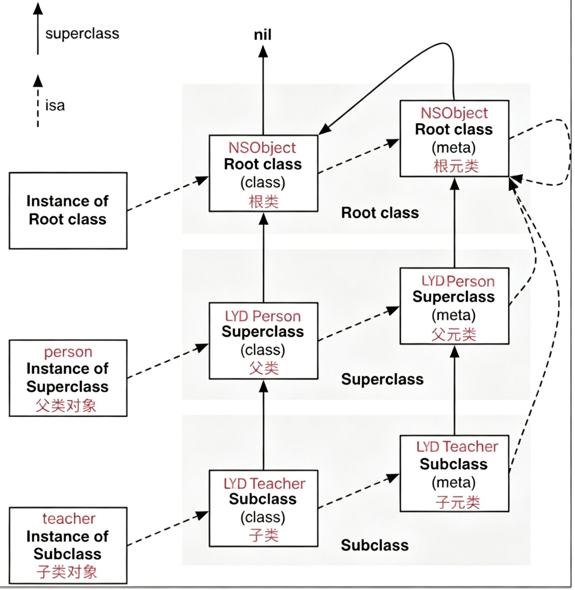 - 根元类继承自根类(Rootclass),此时的根类是指NSObject