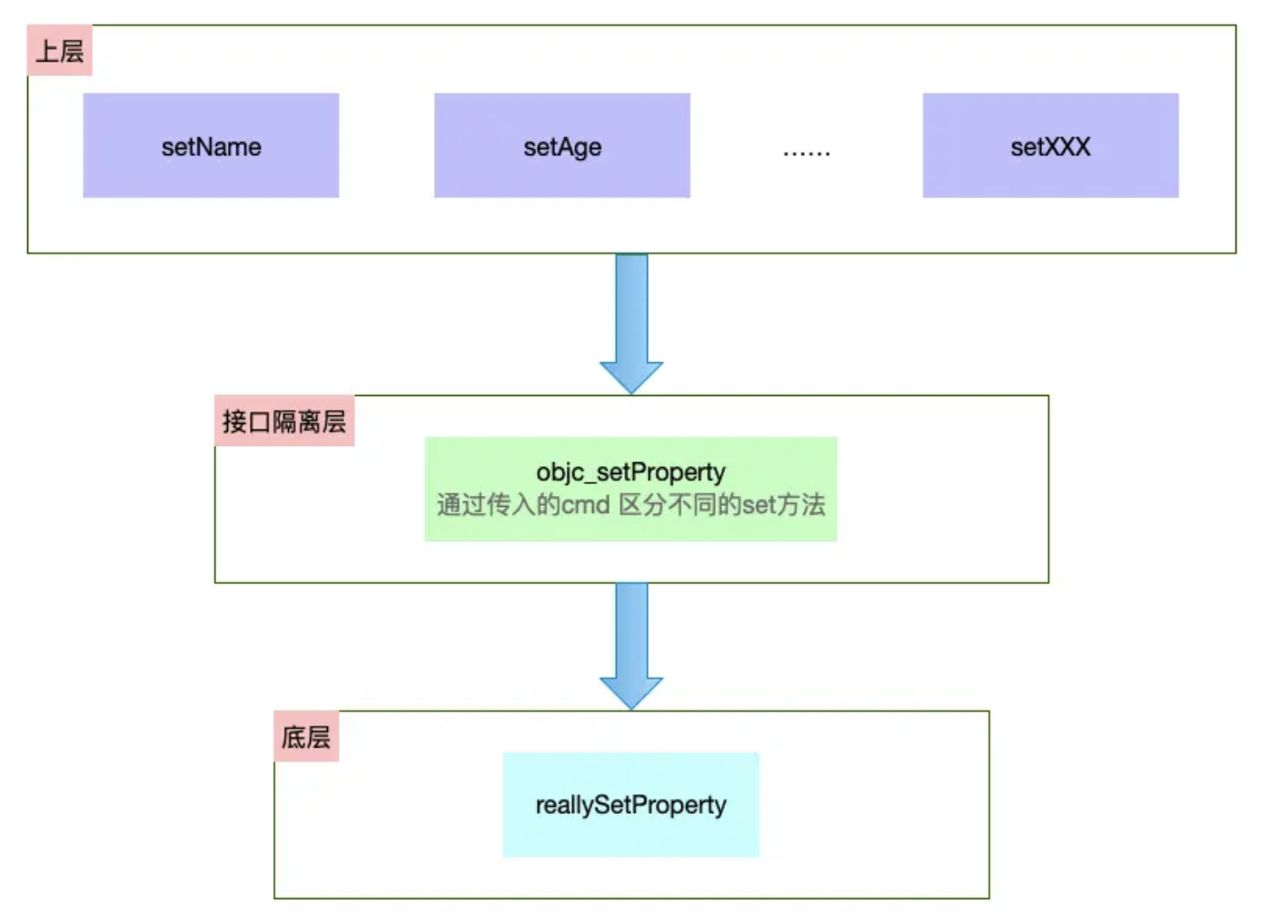 objc_setProperty方法本质是就是一个接口,适用于关联上层的set方法以及底层的set方法。这么设计的原因是:上层的set方法有很多,如果直接把底层的reallySetProperty()方法结合到每一个set方法中,会带来很大开销。因此iOS采用了适配器设计模式(即把底层接口适配为客户端需要的接口),对外提供一个接口,供上层set方法使用,对内调用底层的set方法,使其相互不受影响,达到上下层接口隔离的目的。