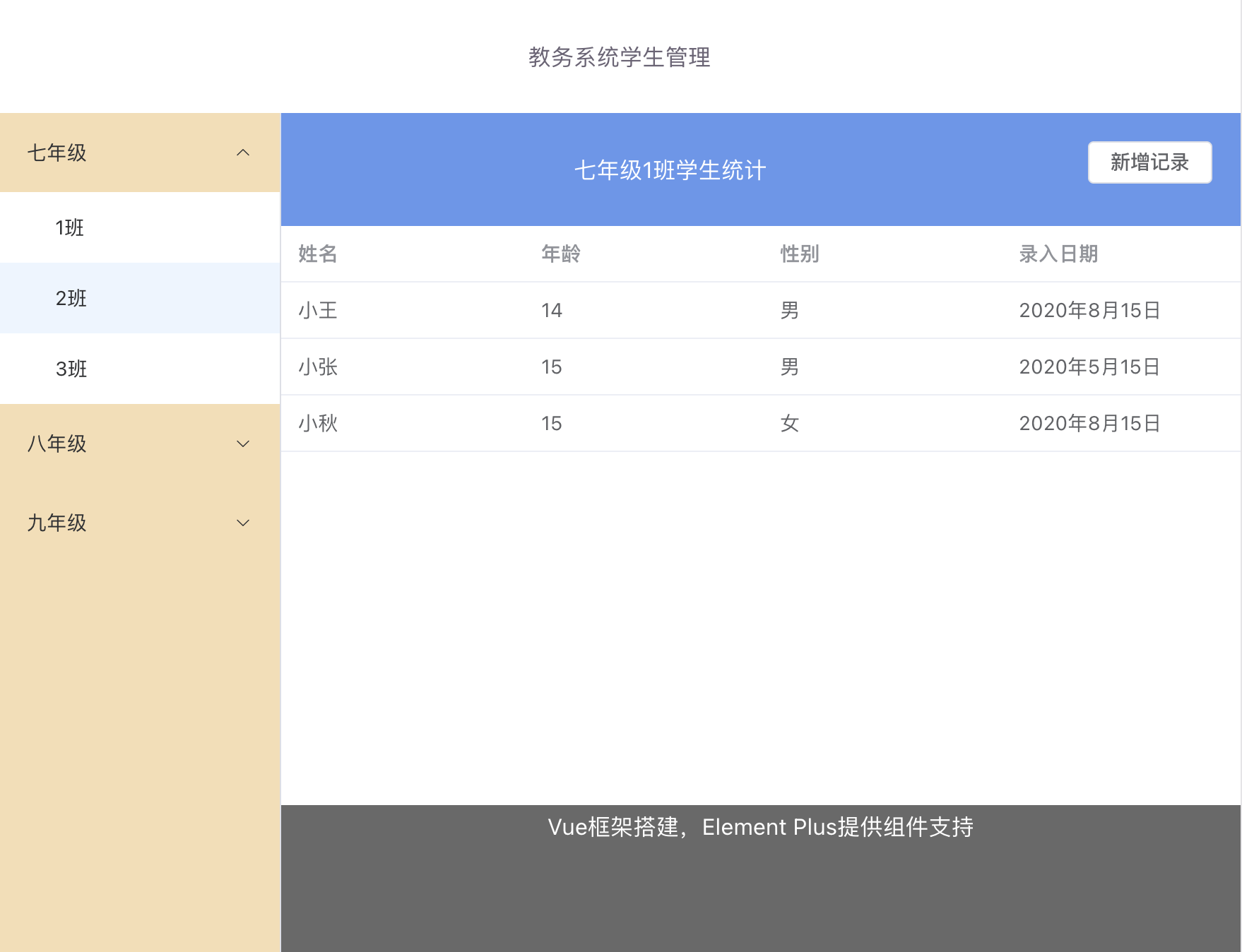 页面设计如下:页面由三部分组成。首先是顶部的标题栏,用于展示当前页面的名称。其次是左侧的侧边栏,用于选择年级和班级。中间的内容区域进一步分为两个部分,上半部分是标题区,显示一些控制按钮,例如"新增学生信息"和"搜索学生信息";下半部分则展示当前班级的完整学生列表,包括学生的姓名、年龄、性别以及信息添加的日期。页面布局的草图如图所示。
