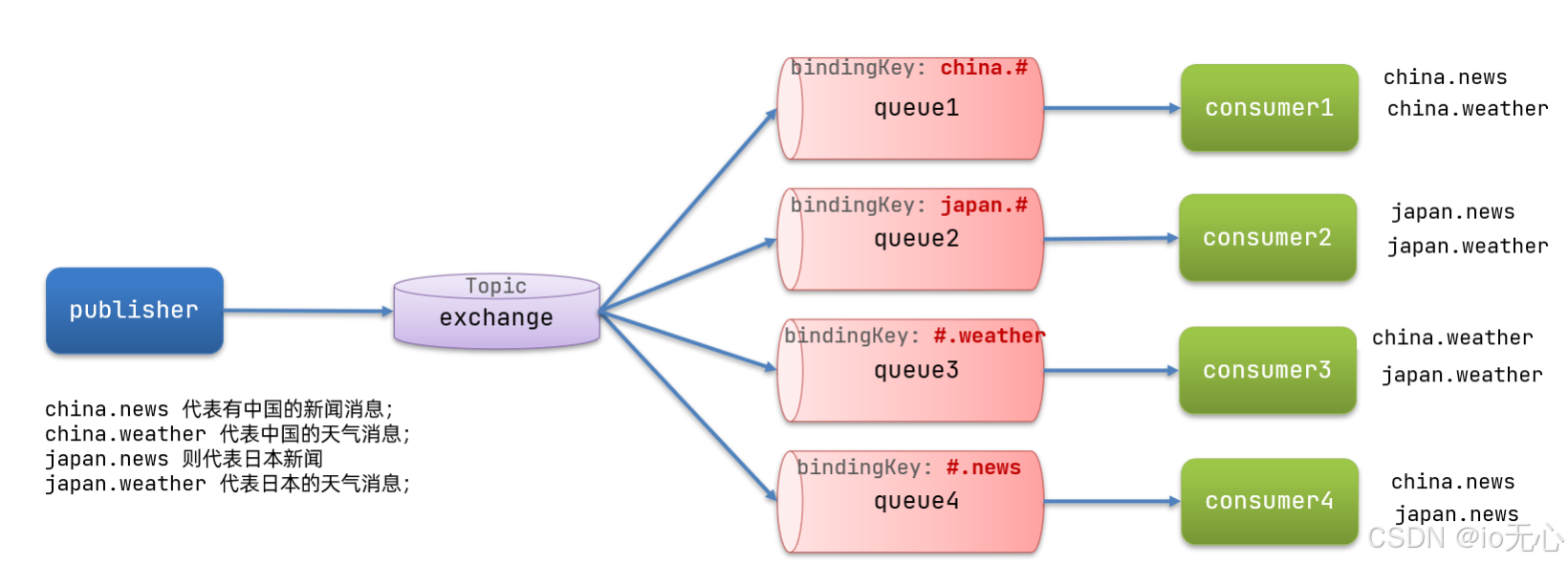 china.#,因此凡是以china.开头的routing key都会被匹配到。包括china.news和china.weather -