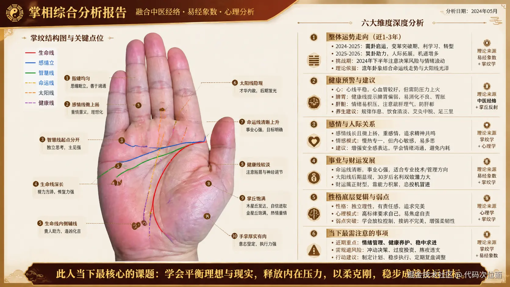 这是给自己测试的一个手相报告, 感觉说的蛮准确的, 您也赶紧试试吧!