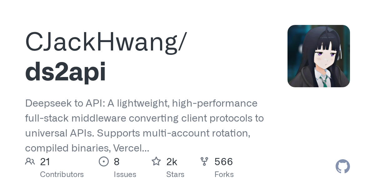 - 📋 项目介绍: Deepseek to API: A lightweight, high-performance full-stack middleware converting client protocols to universal APIs. Supports multi-account rotation, compiled binaries, Vercel Serverless, and Docker. Compatible with Google, Claude, and OpenAI API formats.
