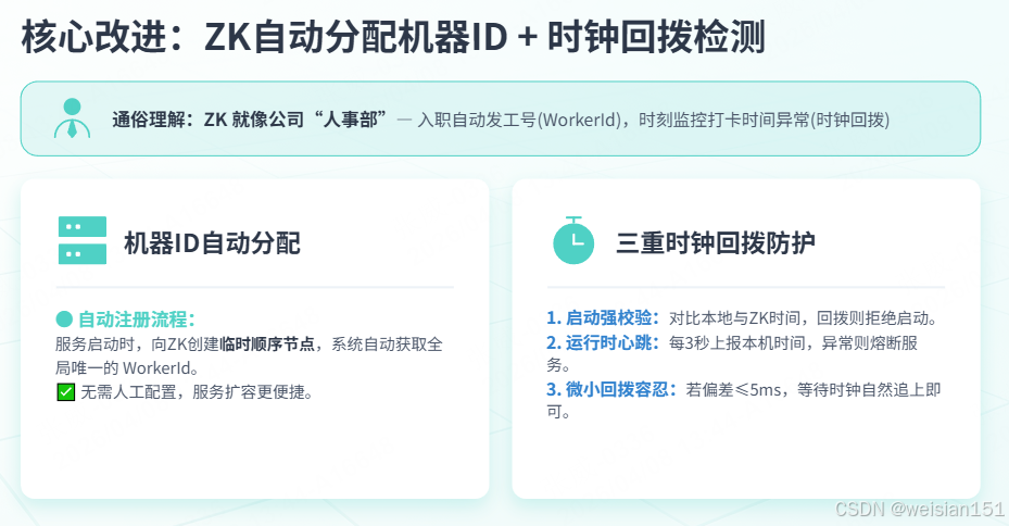 | 美团Leaf-雪花模式 | ZK分配机器ID + 时钟回拨检测 | 机器ID自动分配、时钟回拨可恢复 |