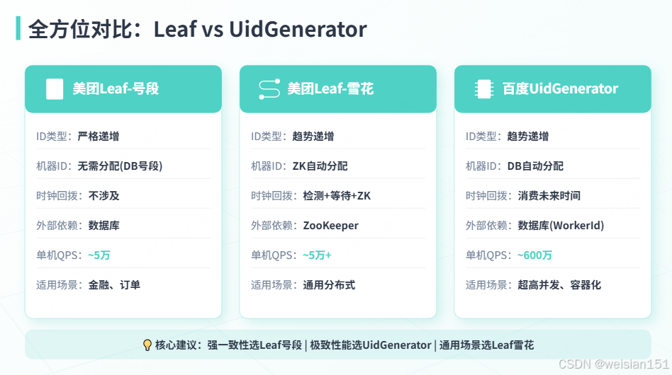 - 综合推荐:大多数场景Leaf号段模式足够,追求极致性能用UidGenerator。