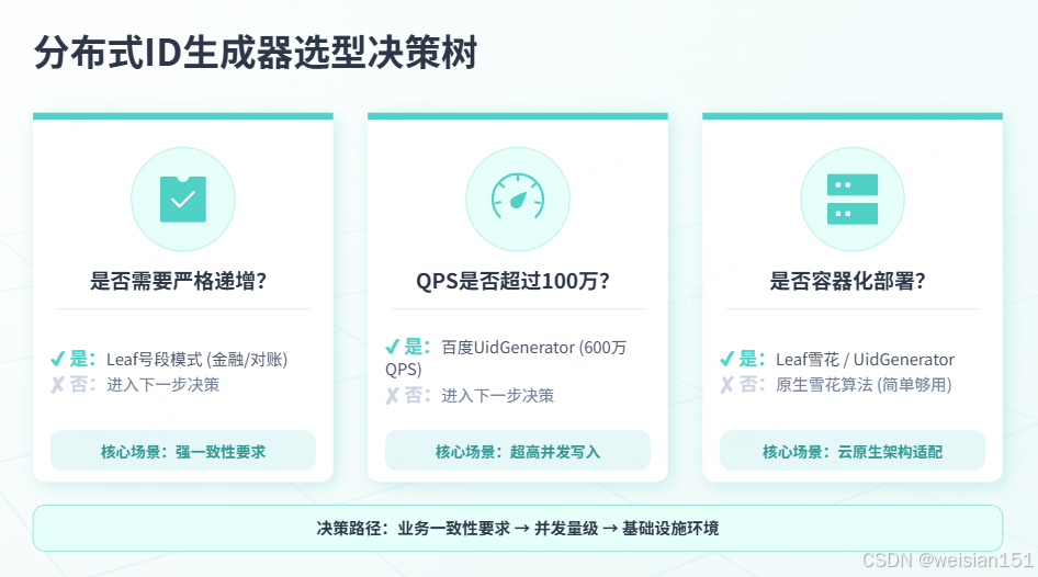 - 容器化部署首选UidGenerator(支持实例重启自动分配机器ID),对有序性要求高选Leaf号段模式。