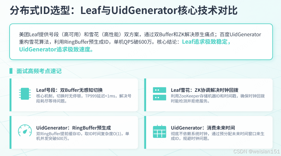 原生雪花算法解决了"本地生成、高性能、趋势递增"的问题,但留下了"机器ID分配、时钟回拨"的坑。Leaf用ZK填了这些坑,同时提供了号段模式满足严格递增需求。而UidGenerator则在性能这条路上走到了极致------RingBuffer预生成、可配置位数、600万QPS。
