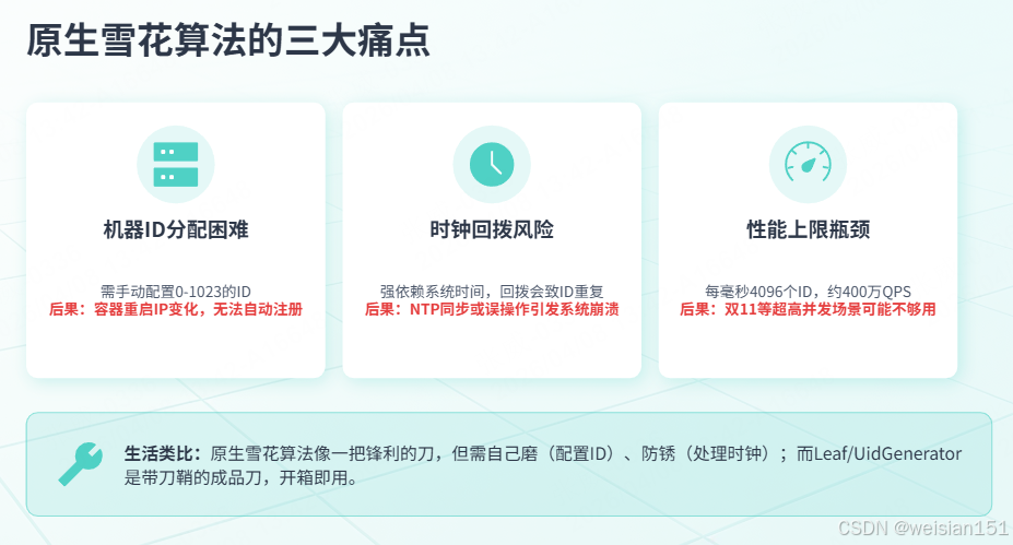 生活类比:原生雪花算法就像一把锋利的刀,但需要你自己磨(配置机器ID)、自己防锈(处理时钟回拨)。而Leaf和UidGenerator是带刀鞘、带磨刀石的"成品刀"------开箱即用。