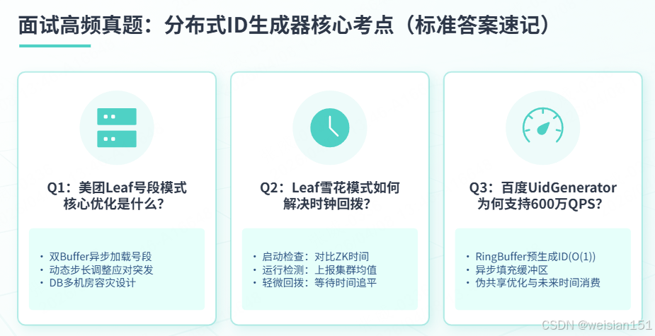 美团Leaf提供号段模式 (严格递增、高可用)和雪花模式 (趋势递增、高性能)双方案,用双Buffer和ZK协调解决了原生算法的两大痛点;百度UidGenerator在雪花算法基础上重构,通过RingBuffer预生成 和可配置位数,单机QPS突破600万,是超高并发场景的首选。两者都是生产级分布式ID的首选,Leaf更稳、UidGenerator更快。