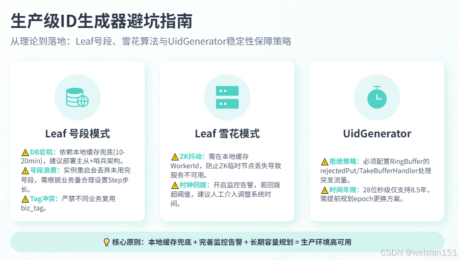 | workerId耗尽 | 10位最多1024节点,大型集群需扩展位数或使用号段模式 |