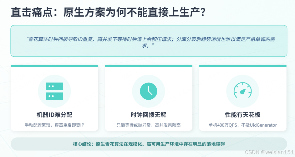 - 原生雪花:时钟回拨会生成重复ID,不可直接上生产;