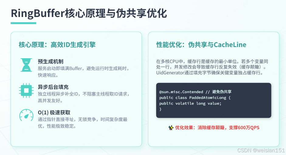 @Contended注解避免缓存行伪共享; - 时间以秒为单位:减少序列号竞争,每秒8192个并发,通过消费未来时间解决时钟回拨。