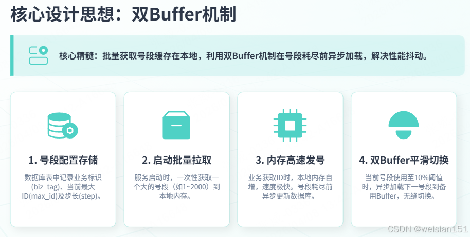一句话概括:一次从数据库获取一批ID(号段),缓存在本地内存,用完了再去取。用双Buffer优化解决"取号段时卡顿"的问题。