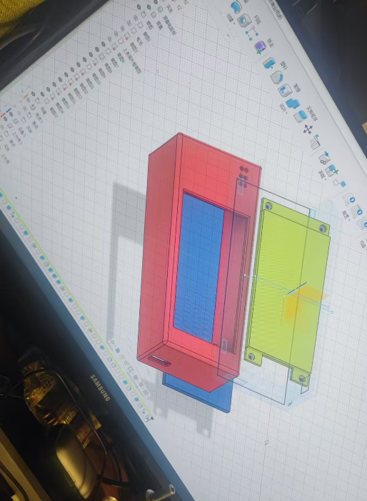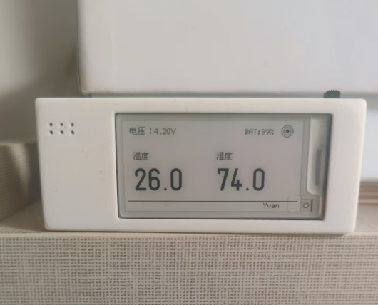 这个温湿度计的特点就是极致的省电,1000毫安电池,充满电用个7-8个月没问题,采用深度睡眠模式+局部刷新,每隔60秒探测一次温湿度,如果温湿度变化小于阈值,继续沉睡,如果大于阈值才会局部刷新。电池电压和电量通过分压电阻,用引脚1做了ADC检测来显示电量。后付代码,包括外壳也是我用Fusion自己画的,做完的成品效果如图: