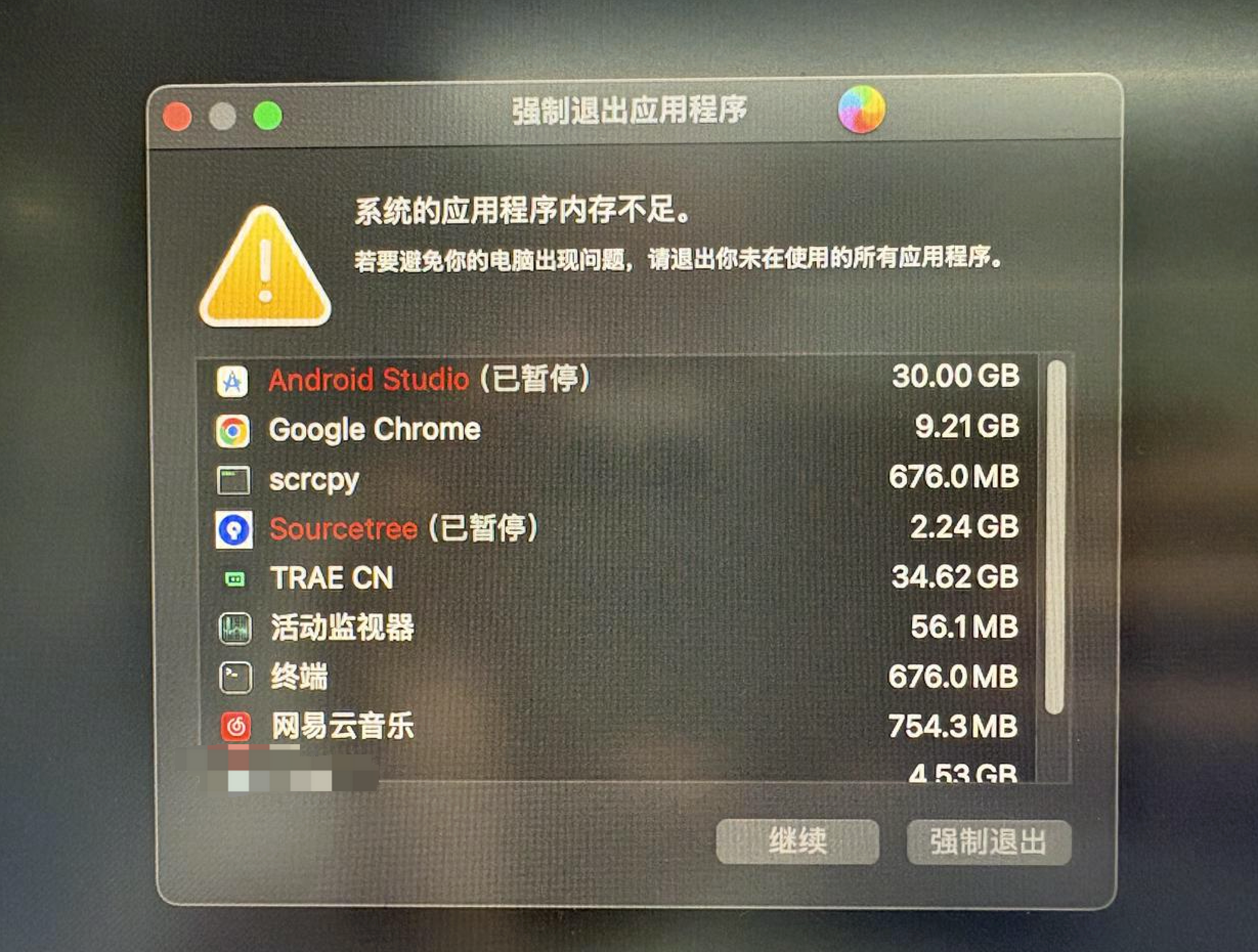 在使用 Trae 做超大代码量的工程开发时,经常出现电脑被卡死的情况,只能通过强制退出的方式来解决,非常影响开发效率和心情(下图是我通过手机拍摄的,不要问题我为什么不用电脑截图,因为电脑被卡的死死的):