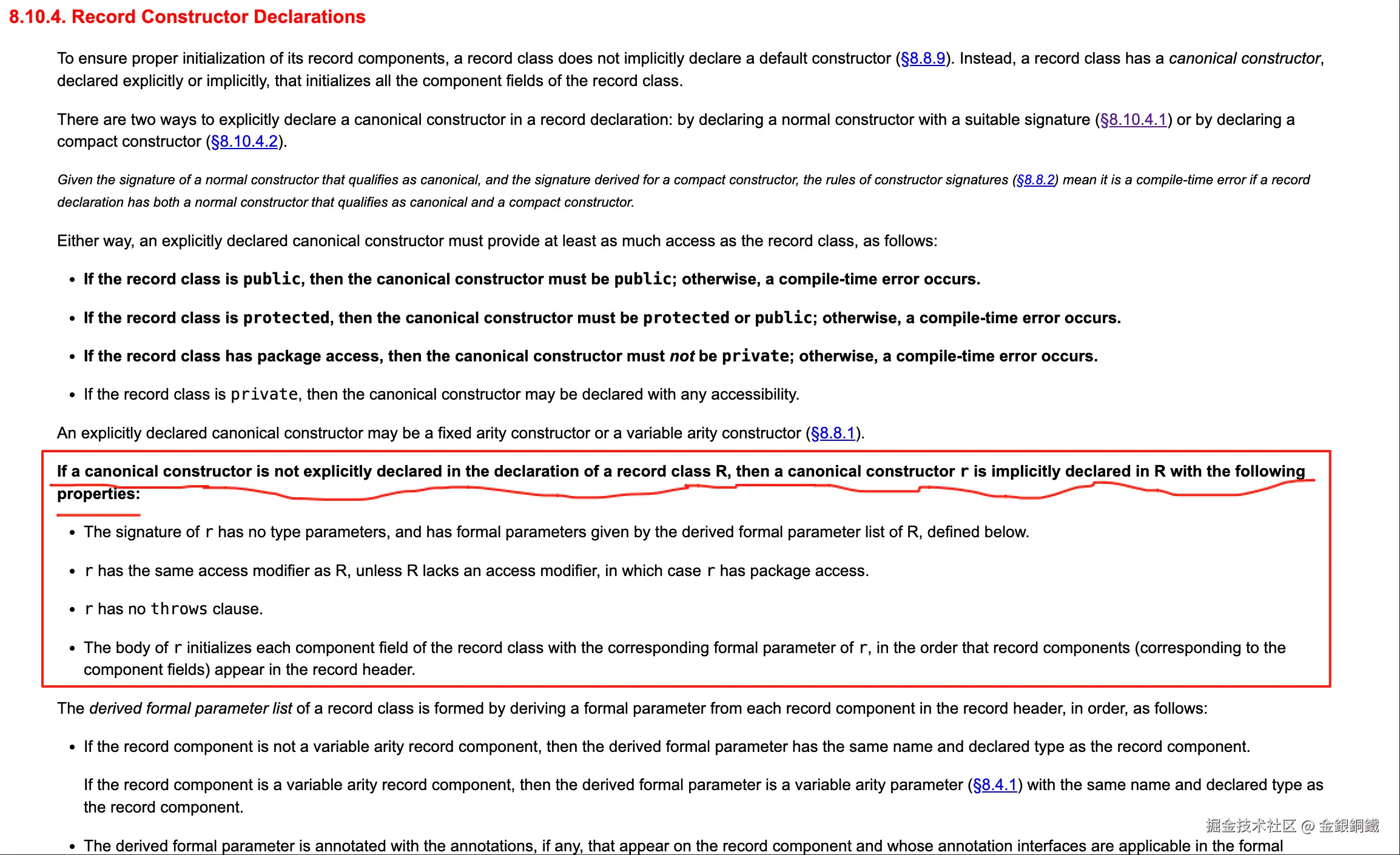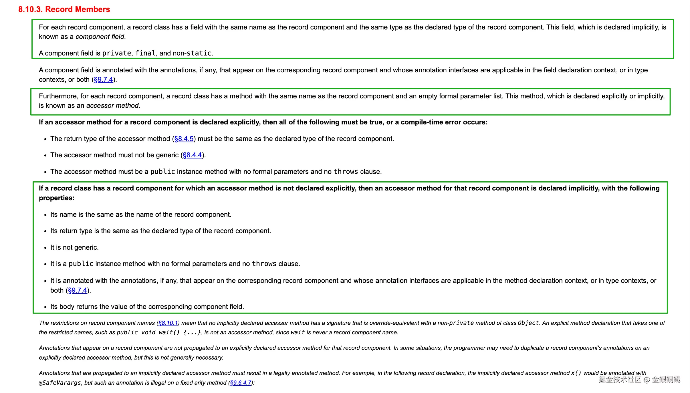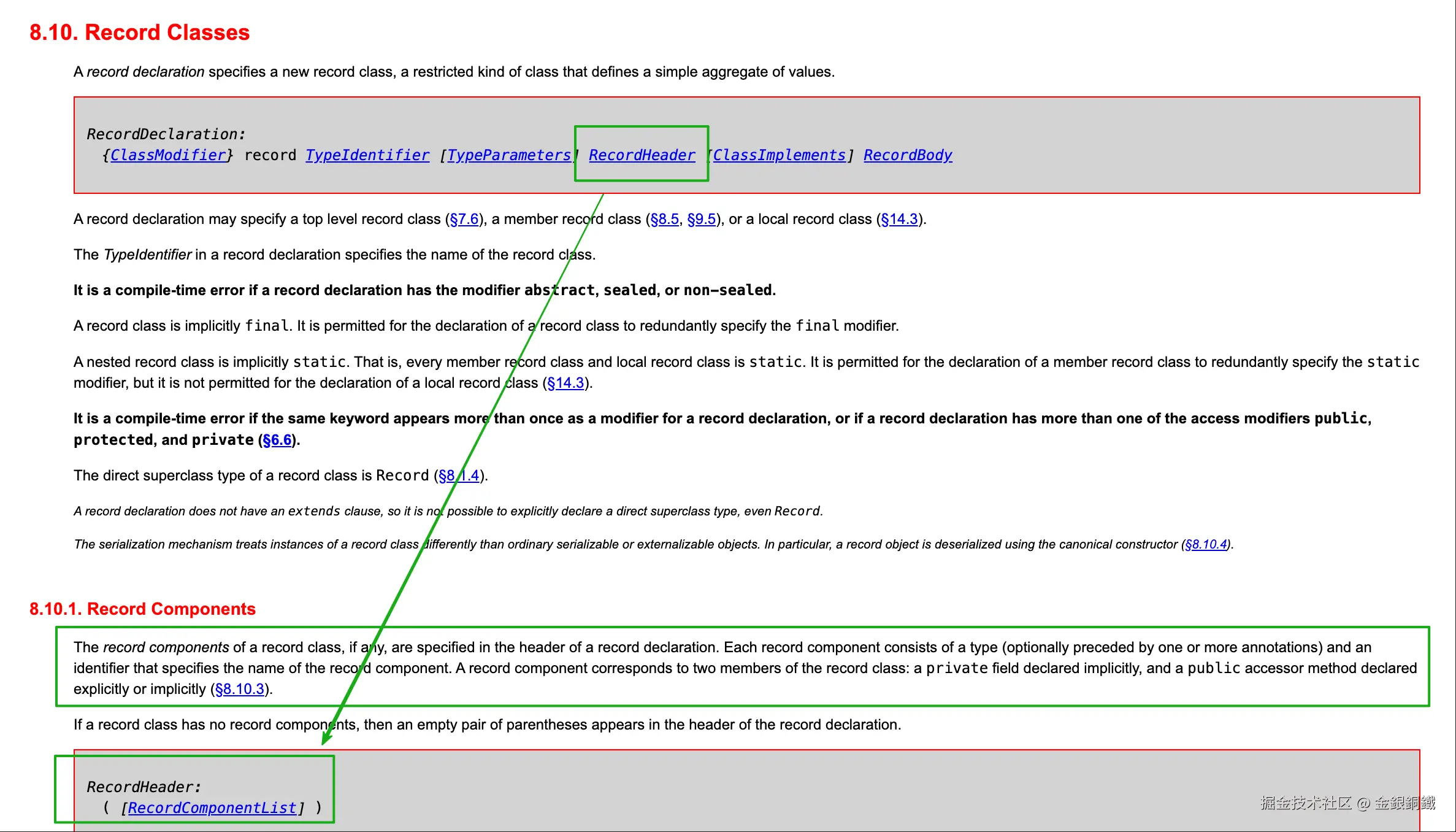在 8.10. Record Classes 中提到了 <math xmlns="http://www.w3.org/1998/Math/MathML"> Record Components \text{Record Components} </math>Record Components ⬇️ (重要的部分我用绿色框和绿色箭头标了出来)