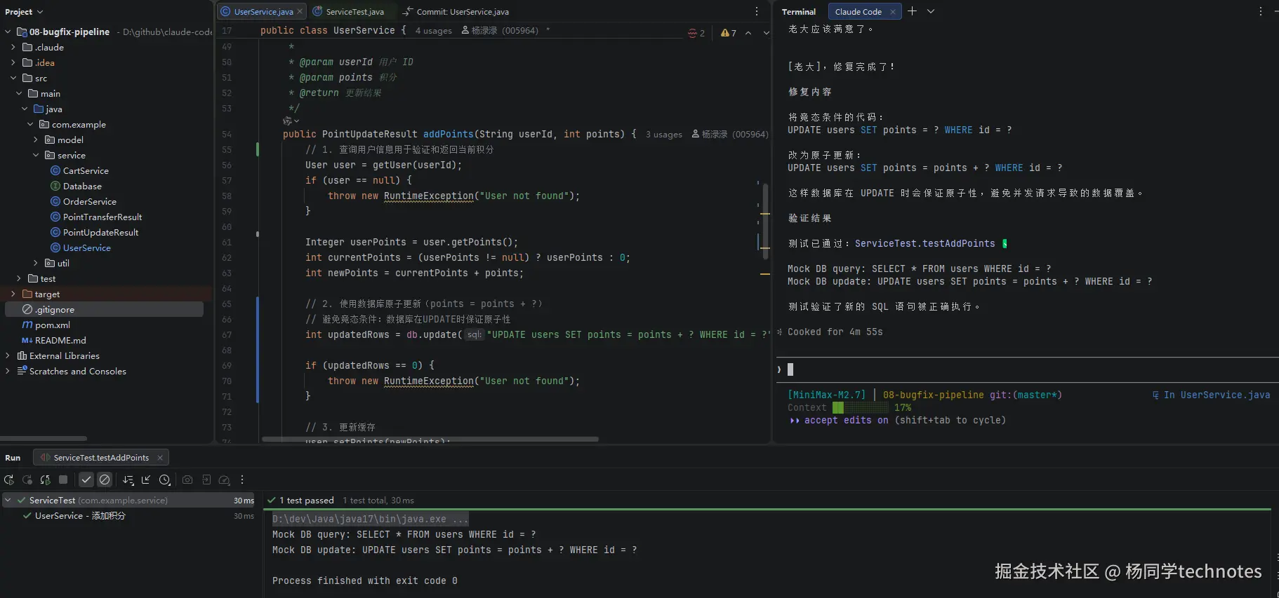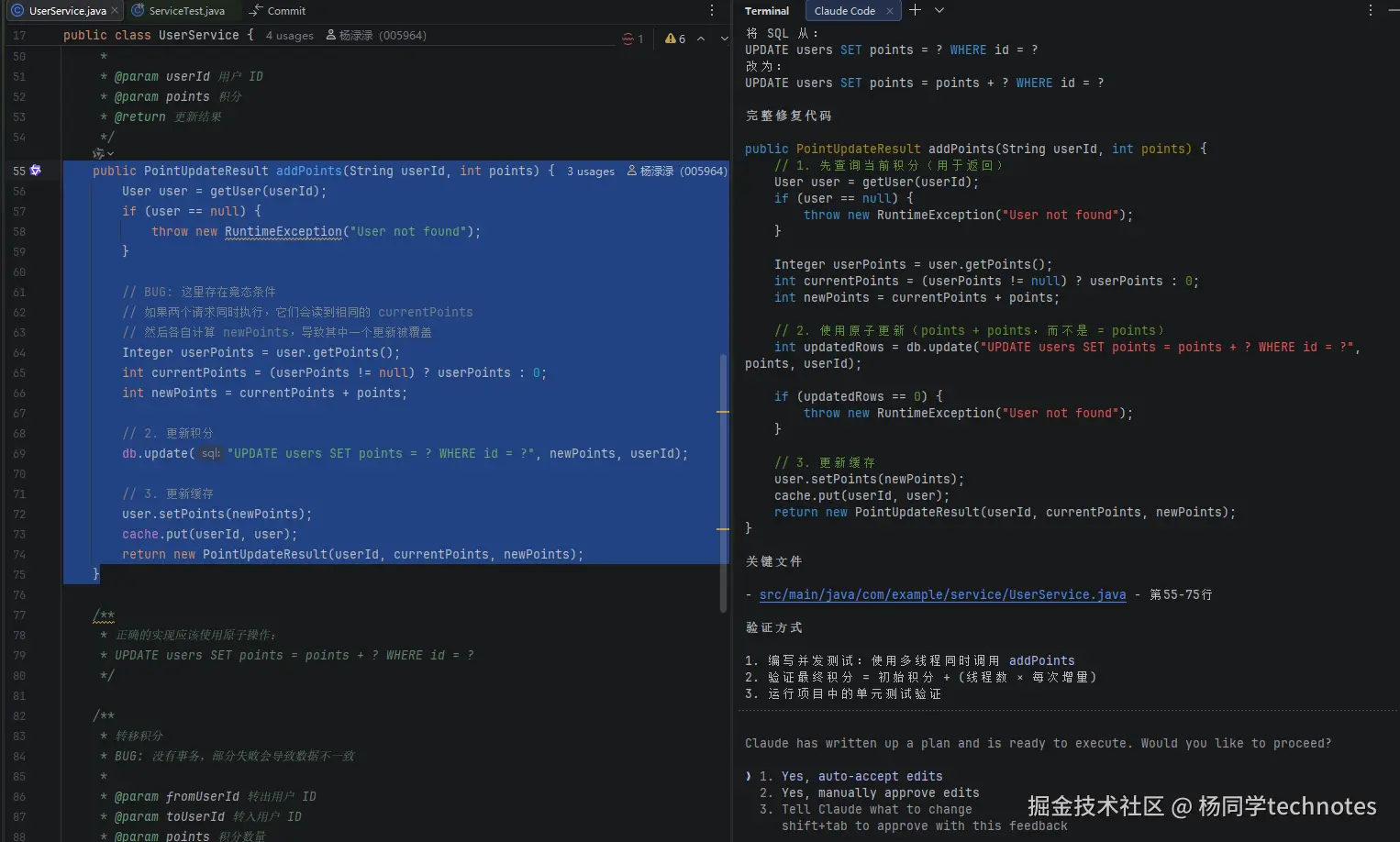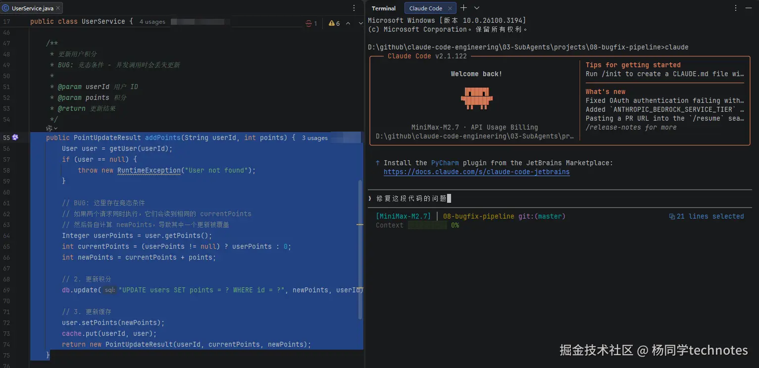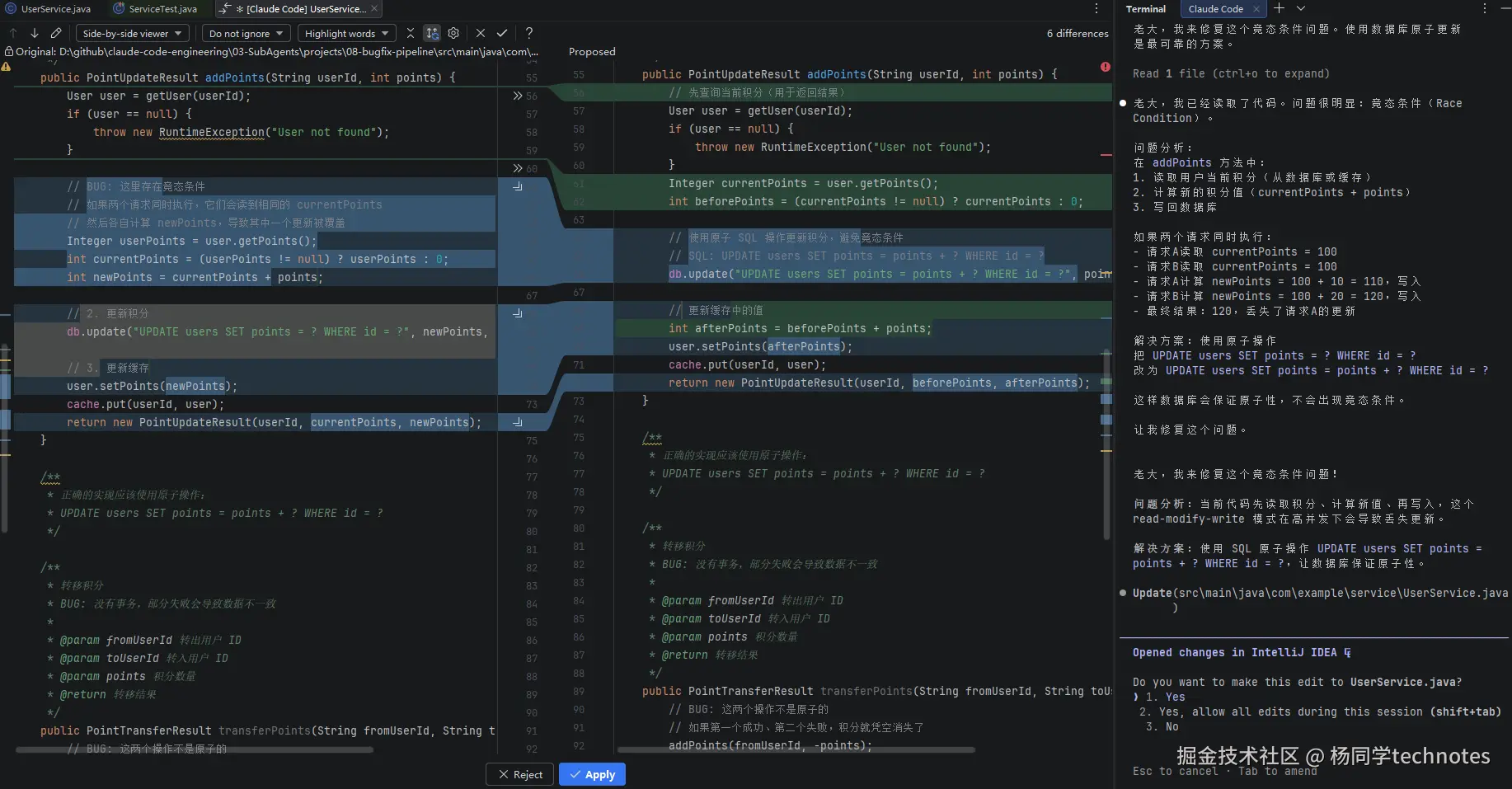 比如在 IDEA 里选中一段代码,然后对 Claude 说:修复这段代码的问题,效果如下图所示: