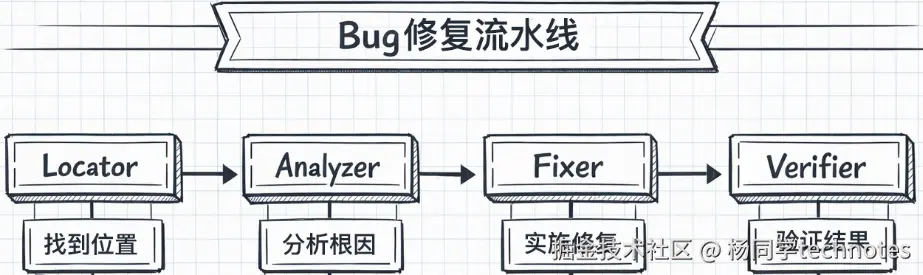 │ Locator │ ────→ │ Analyzer│ ────→ │ Fixer │ ────→ │Verifier │