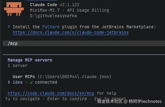 第三步:验证连接。在 Claude Code 里输入 /mcp。