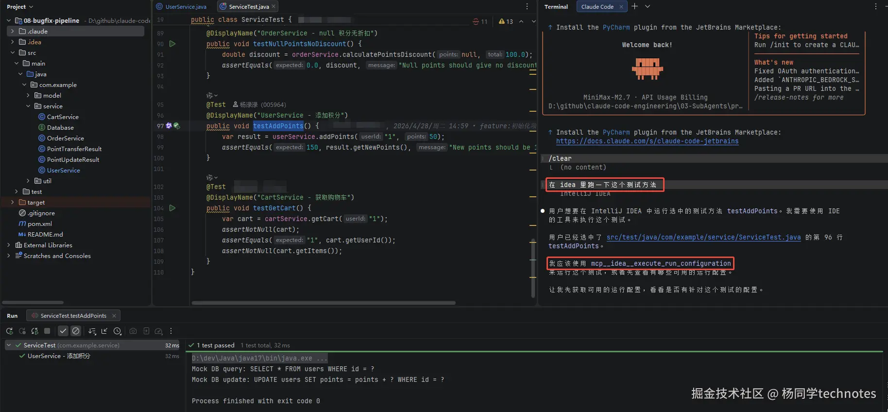 配置好 IDEA Mcp 后,就可以对 Claude 说:在 idea 里跑一下这个测试方法。