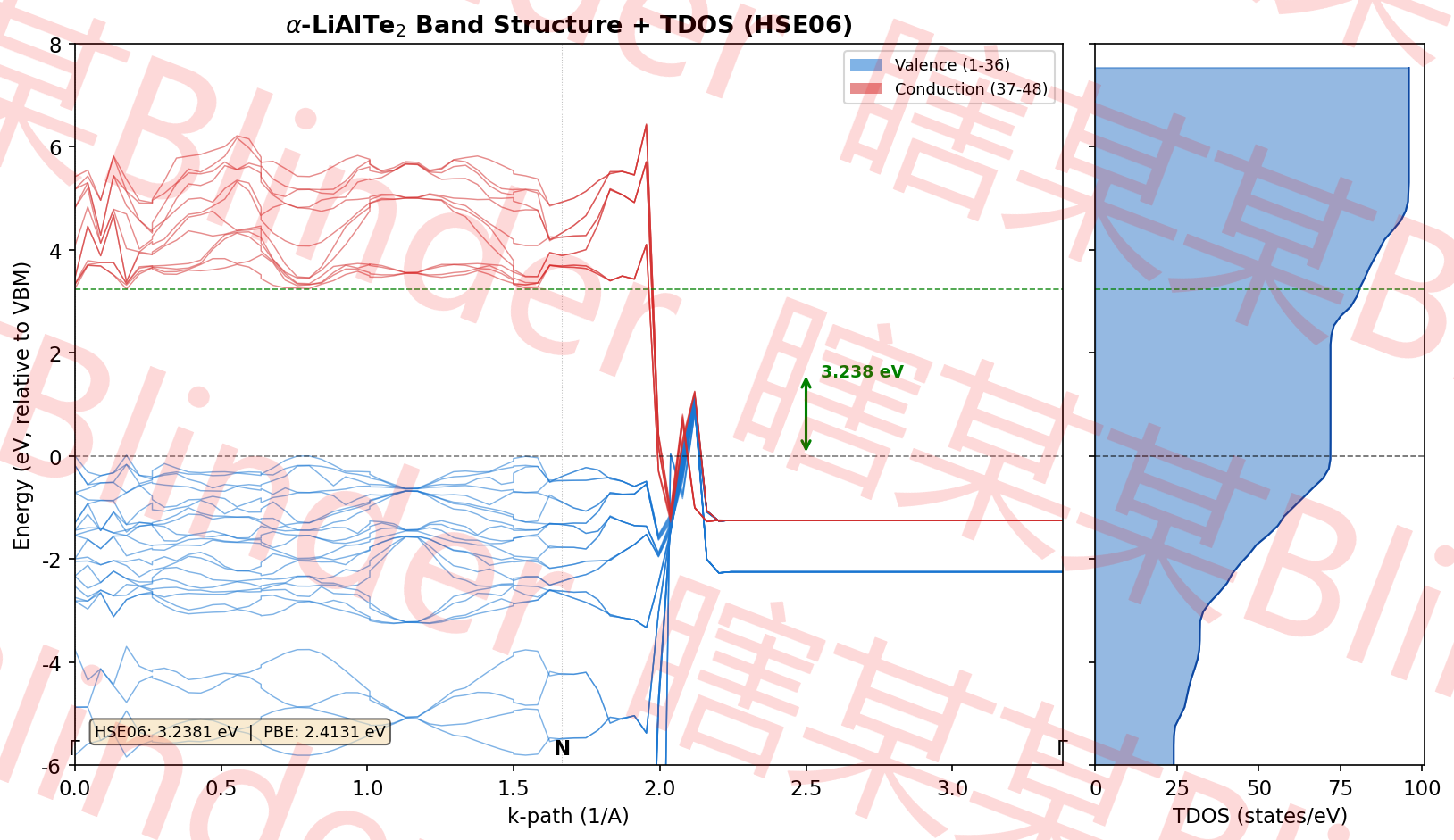 我在对LiAlTe2进行计算之后,发现PBE算出来的带隙宽度为2.41eV,material project里的为2.44eV,使用HES06计算出来的为3.24eV,这就和历史研究中的结果非常接近了。