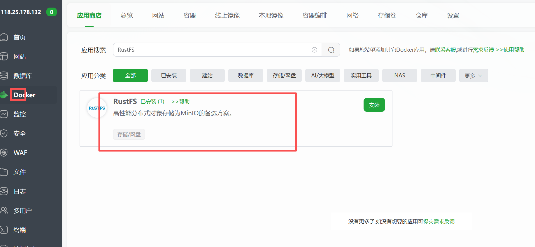 这里是用的宝塔面板,先安装docker 在dcoker下面安装 RustFs容器